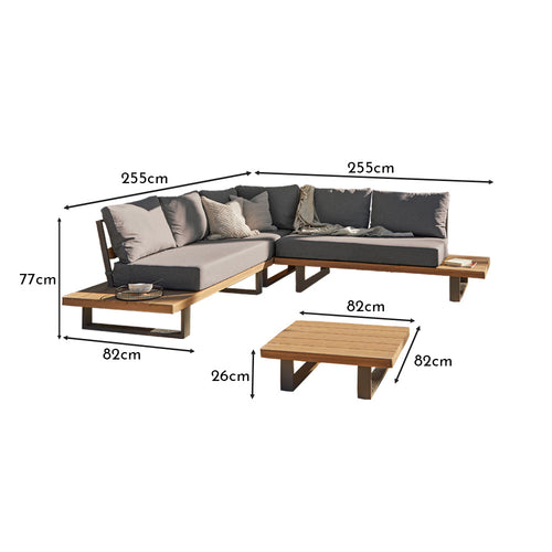 The Shiva garden corner sofa set is a perfect addition to your garden for plentiful moments of relaxation amidst the beauty of nature. Featuring a dark toned wooden and metal frame, adorned with dark grey cushions, the Shiva garden sofa set achieves a harmonious blend of textures, colours, and style. This corner garden sofa set is complete with grey LED premium parasol.