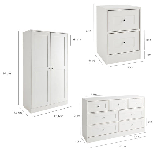 This sleek bedroom furniture set comprises of three pieces of furniture: a shaker style bedside table, a wide chest of drawers, and a wardrobe.