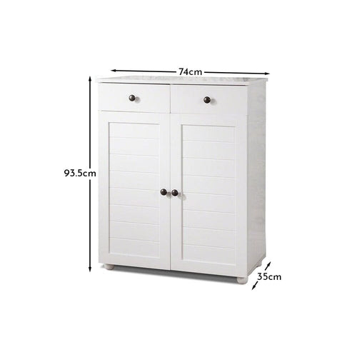 This hallway storage unit is the perfect addition to any home. With two doors that expose the main storage compartment perfect for storing footwear. It also has two drawers for additional storage space. Black round handles add contrast to this is a classic wooden shaker style cabinet.