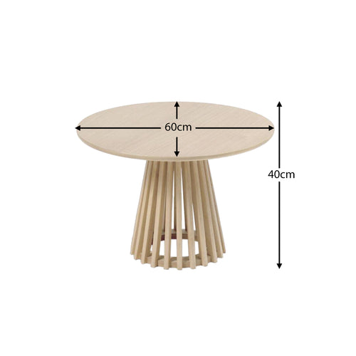 The Willow pale oak coffee table by Laura James is the perfect addition to your living space this season. Designed with style and function in mind, this wooden coffee table with structural design inspired by Japandi décor is modern and creative, featuring a tapered pedestal base with slatted wood panels, topped with a circular wood top.